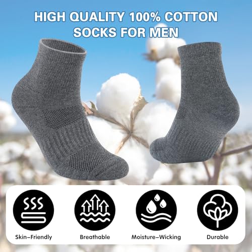 Mens 100% Cotton Cushioned Ankle Socks, Moisture Wicking Breathable Athletic Performance Running Quarter Socks 4