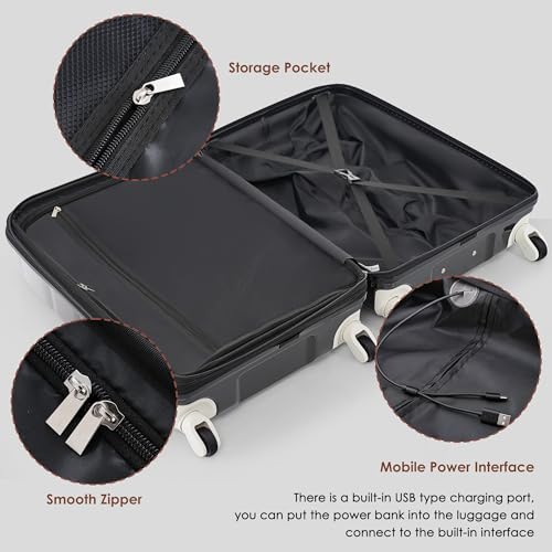 Luggage Set of 3, 20-inch with USB Port, Airline Certified Carry-on Luggage with Cup Holder, ABS+PC Hard Shell Luggage with Spinner Wheels, black 5