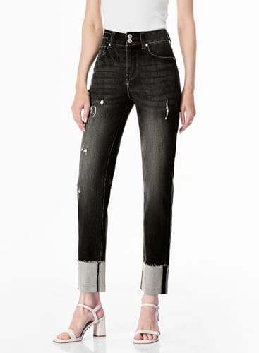 Sidefeel Women's High Waisted Tummy Control Jeans Cuffed Boyfriend Straight Leg Two Buttons Ripped Denim Pants 6
