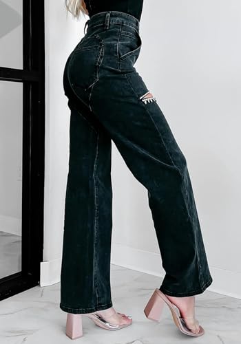 More information about Unybwonn Women High Waist Baggy Ripped Jeans Rhinestone Trim Bling Denim Pants Y2k Straight Wide Leg Pants Streetwear