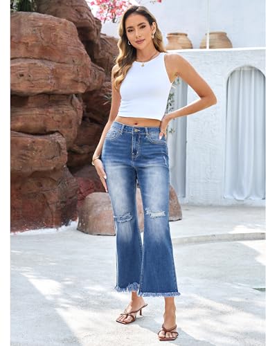 GRAPENT Flare Jeans for Women Trendy High Waisted Cropped Ripped Jeans Wide Leg Stretchy Denim Ankle Pants Raw Hem Jeans 1