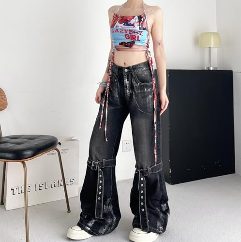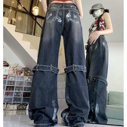 More information about Fashion High Waist Straight Baggy Jeans for Women Vintage Gothic Leg Drawstring Y2K Scrawl Denim Pants