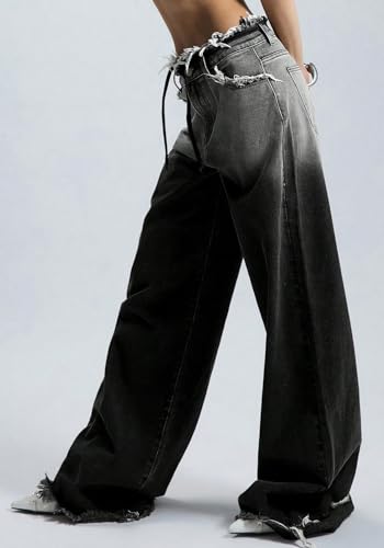 Famnbro Womens Baggy Jeans Frayed High Waisted Y2k Gradient Straight Wide Leg Raw Hem Boyfriend Cargo Denim Pants 4