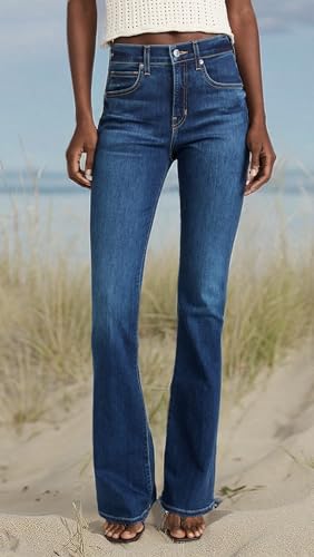 • Runs true to size, Intended for a high-rise fit. Flare legs have a snug fit through the hip and thigh. Inseam runs long. Stretch denim has a smooth texture and a lived-in feel.