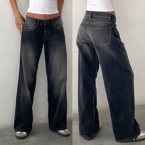 HOT ! Women's Low Rise Baggy Jeans Boyfriend Y2K E-Girls Straight Wide Leg Denim Jeans Retro Casual Loose Denim Pants