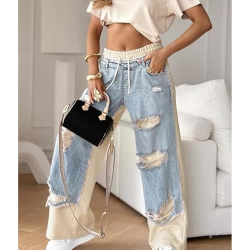 HOT ! Women's Denim Trousers with Stitching and Ripped Design,Patchwork High Waisted, Casual Retro Loose Drawstring Ripped Jeans