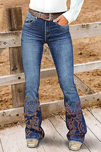 Women's Flared Bell Bottom Jeans with Embroidered Detailing, Denim Pants Trousers (Belt Not Included) 1