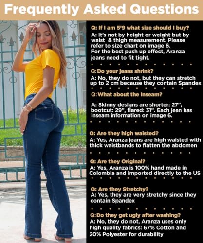 • 👌 HOW WE ARE DIFFERENT: Hand made in Colombia and crafted with premium denim. Our Colombian Butt Lifting Pants for women have the best quality you will find with 67% COTTON: for smoothness and durability (most brands use 50%); 20% POLYESTER: for resistance, 10.5% RAYON: for flexibility and 2.5% Spandex for stretchiness. Aranza is the only brand with 15 designs, we have more colors, styles and plus sizes and only use premium accessories accents like leather, stones, embroidery, zippers and more