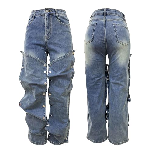 More information about LETSVDO Women's High Waisted Cargo Jeans Straight Wide Leg Baggy Detachable Patchwork Asymmetrical Stretch Denim Pants