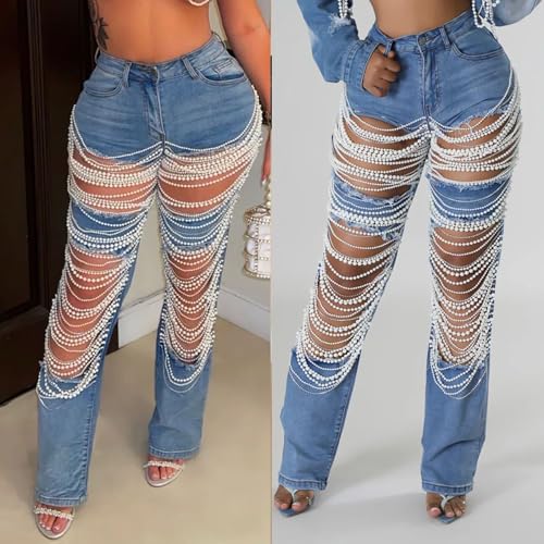 More information about DINGANG Women's Cut Out Straight Leg Ripped Jeans with Rhinestones Pearl Bling Distressed Stretchy Denim Pants