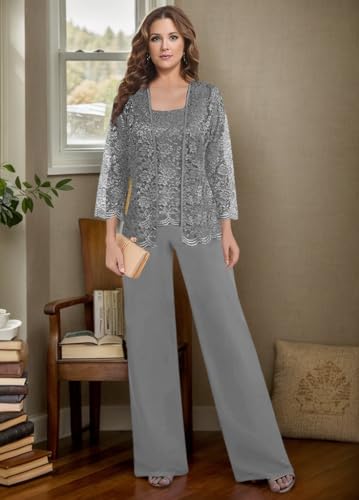 3 Pieces Mother of The Bride Pant Suits for Women Dressy Chiffon Lace Wedding Formal Outfit 1