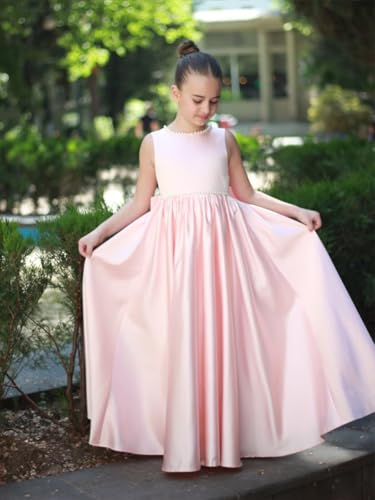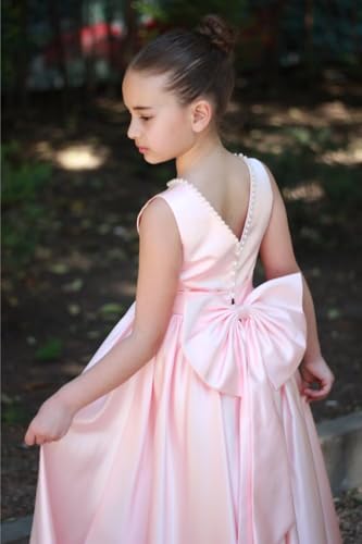 More information about Satin Flower Girl Dress for Wedding Pearls Crewneck Long A-Line Princess Kids First Communion Pageant Party Bow Ball Gowns