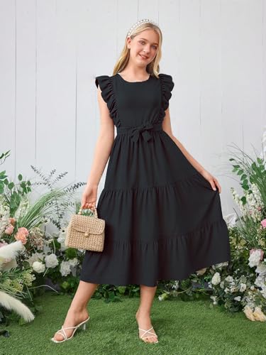 Girls Summer Dresses Ruffle Sleeve Dress A Line Swing Belted Casual Solid Color Party Dress 6-14 Years 4