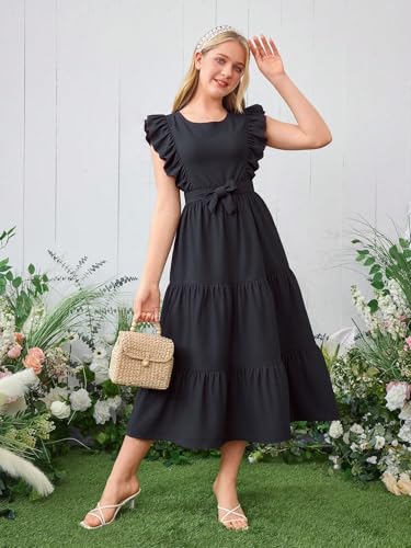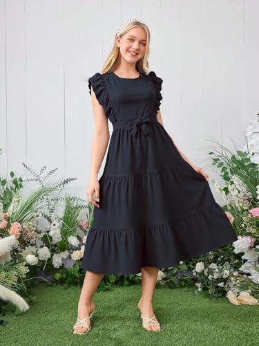 Girls Summer Dresses Ruffle Sleeve Dress A Line Swing Belted Casual Solid Color Party Dress 6-14 Years 6