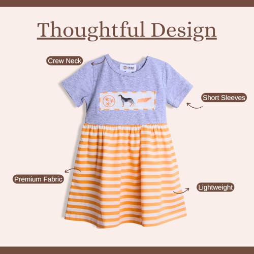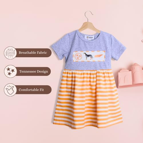 • Tennessee-Inspired: Celebrate Tennessee with this Tennessee orange dress featuring a vibrant orange state outline, a bluetick coonhound, and an orange tri-star emblem. Perfect for young fans showing off their Tennessee pride.