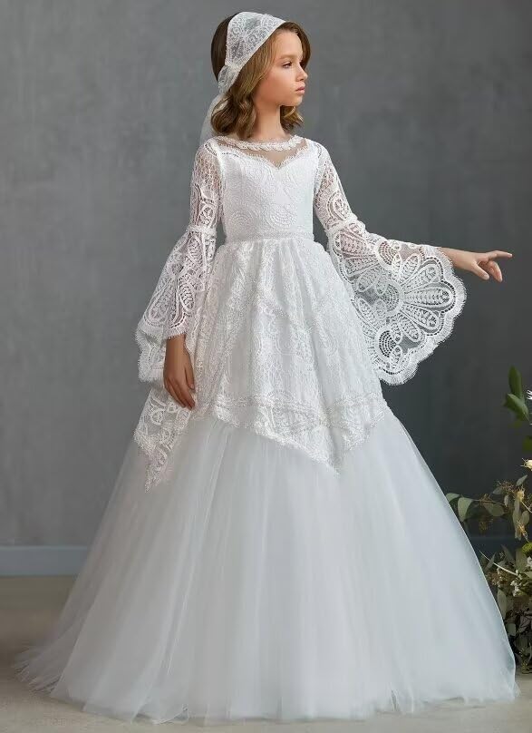 • Features: Flower girl dresses for wedding features round neck and cross back, long sleeves, lace appliques, A-line, high waist, long prom ball gowns, tulle pageant dresses, girls first communion dress. Your little princess will be thrilled with this gorgeous lace tulle flower girl dress.
