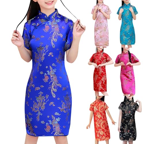 Girls Cheongsam Qipao Dress Chinese Floral Dragon Pattern, Wedding New Year Party Dress, Short Sleeve Holiday Outfit 6