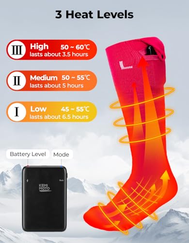 • 3 HEAT LEVELS: Powered by 2 KEMIMOTO's 5V 5000mAh batteries, The heated ski socks women can be adjusted to the comfy heat level. LOW: 45-55℃/113-131°F, lasting 6h; MEDIUM: 50-55°C/122-131°F lasting 4h; HIGH: 55-60°C/131-140°F 3h