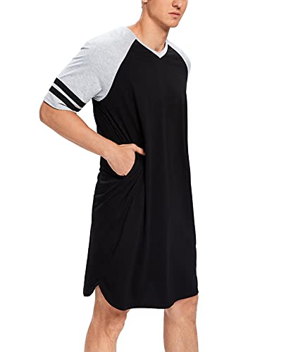 • 【LOOSE PULLOVER DESIGN】- Short Sleeve Sleep Shirt for men with contrast colored striped V-neckline and cuffs, Loose fit style, Knee Length, Long sleep shirt with pockets. Pullover nightshirt design is easy to put on and take off, Perfect for lounging & shopping&matches with your daily leisure&relaxing around the house on Weekends.