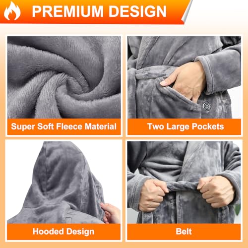 HOT ! Heated Robe for Men with Hood - Men's Heated Bathrobes with 3 Heating Modes Warm Long Fleece Bathrobe Plush for Winter (US, Alpha, Small, Medium, Regular, Regular, Standard, Grey)