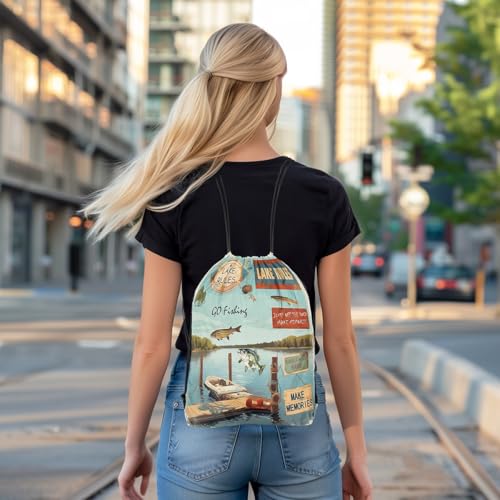HOT ! jejeloiu Lake Drawstring Backpack 13"x15.7" Lakeside Pike Fish Boat Gym String Bag Fishing Sports Sackpack Natural Scenery Waterproof Cinch Bag