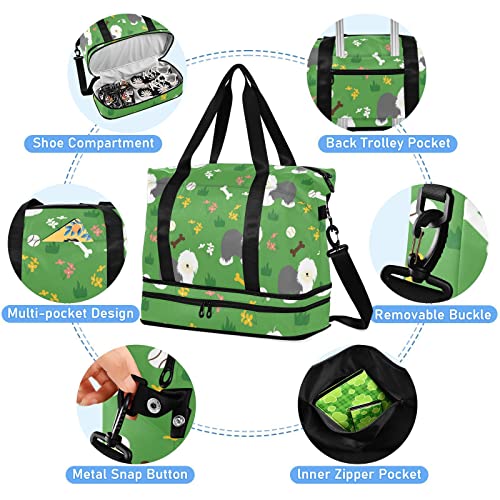 susiyo Green Old English Sheepdog Duffle Bag for Wet Dry Shoe Pocket Gym Yoga Bag Durable Compression Straps & Handles Weekender Overnight Bag for Travel Sports Women Men 4