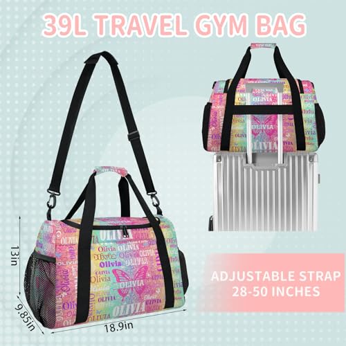 HOT ! Custom Sports Duffel Bag Name Butterfly, Personalized Waterproof Sleepover Carry on Practice Travel Bags, Bright Colorful Rainbow Pink Yellow Aqua Striped