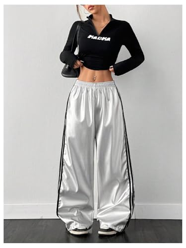 HOT ! Women's Metallic Elastic Waist Sweatpants Side Stripe PU Leather Wide Leg Athletic Pants