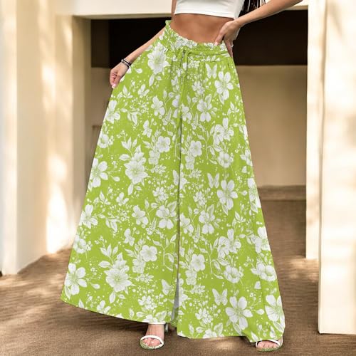 Palazzo Pants for Women Casual High Waist Wide Leg Floral Elastic Lounge Trousers with Pockets 2