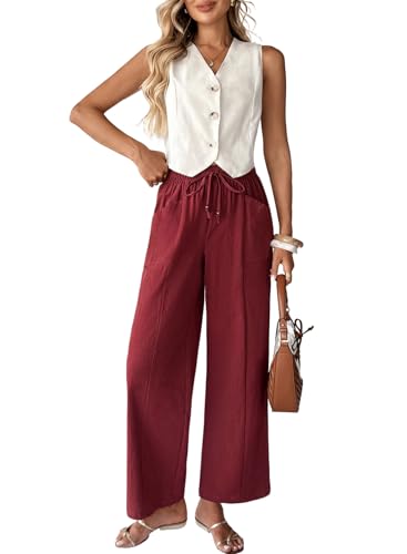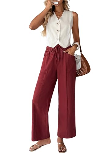 HOT ! Acelitt Womens Cotton Linen Palazzo Pants Drawstring Elastic Waist Casual Wide Leg Trousers with Pockets