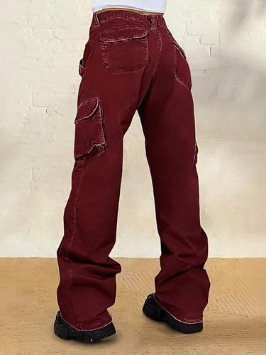 Flamingals Women Solid Flap Pocket Mid Rise Straight Leg Cargo Pants Vintage Stretch Cotton All Season Long Pants 4