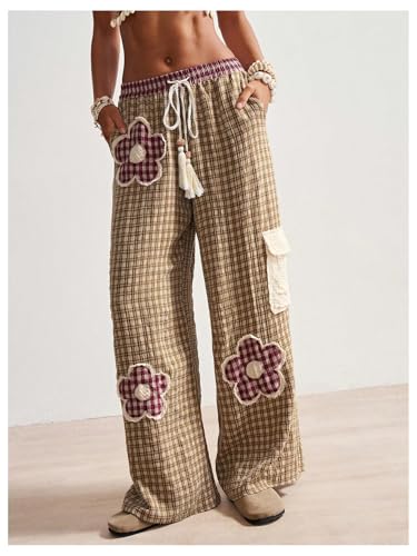 Women's Floral Patch Baggy Pants Plaid Drawstring Waist Wide Leg Causal Trousers with Pockets 1