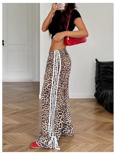 HOT ! OYOANGLE Women's Leopard Print Striped Knot Side Trousers High Waist Straight Leg Baggy Pants