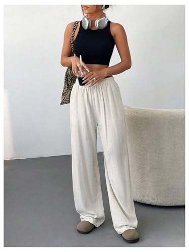 Floerns Women's Linen Wide Leg Pants Elastic Waist Casual Loose Long Trousers with Pockets 5