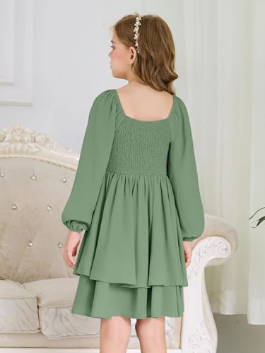 Girls Fall Dress Long Sleeve Dresses Smocked Ruched Square Neck Tiered Flowy Casual Formal Tween Dress 5-14 Years 6