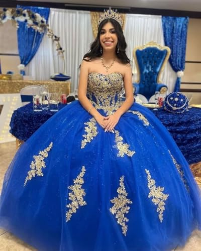 Gold Lace Appliques Quinceanera Dresses Puffy Strapless Tulle Prom Dresses Glitter Beaded Ball Gown with Bow 1
