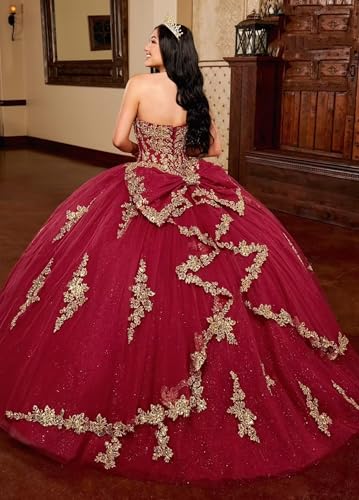 Gold Lace Appliques Quinceanera Dresses Puffy Strapless Tulle Prom Dresses Glitter Beaded Ball Gown with Bow 5