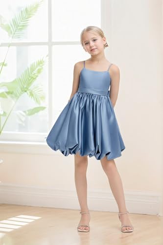 Satin Flower Girl Dresses for Wedding Knee Length Girls Party Dress Junior Bridesmaid Dress with Bow 6