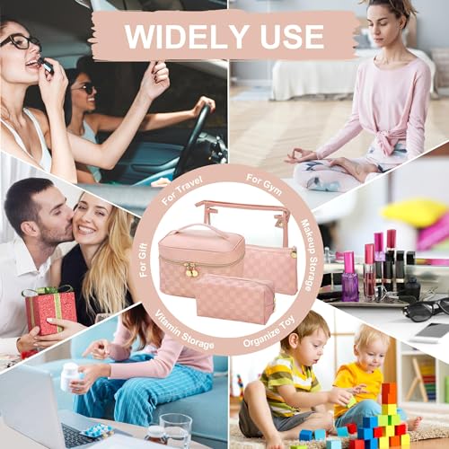 Checkered Makeup Bag 4 Pcs Waterproof Cosmetic Bag Set Portable Travel Cosmetic Bag Multifunction Organizer Storage Bag Toiletry Bag forWomen and Girls (PINK) 3