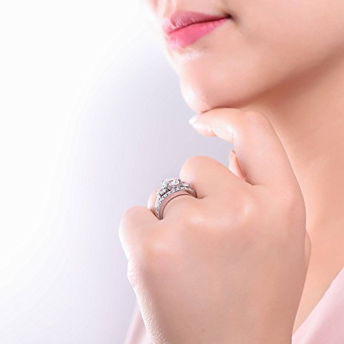 • 925 Sterling Silver: This 3-stone wedding engagement 2 piece ring set is crafted with fine solid sterling silver, stamped 925. Rhodium plated for enhanced durability and tarnish resistance. SIZING TIPS: This ring's band width is wide, so we suggest you choose a ring size 1/2 or 1 size larger than your standard ring size to make sure the ring will fit comfortably.