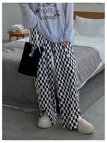 HOT ! OYOANGLE Women's Plaid Print Elastic High Waisted Wide Leg Long Pants Y2k Baggy Trousers with Pockets