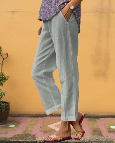 Womens Cotton and Linen Casual Pants Summer Elastic Waist Drawstring Straight Wide Leg Loose Fit Pockets Pant 6