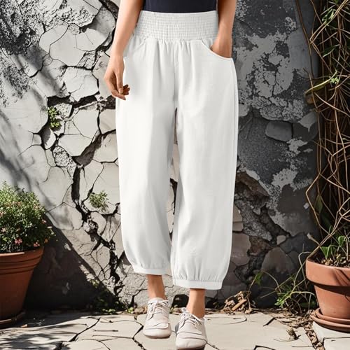 HOT ! Womens Linen Pants Smocked High Waisted Wide Leg Palazzo Pants Loose Fit Casual Summer Beach Trousers with Pockets