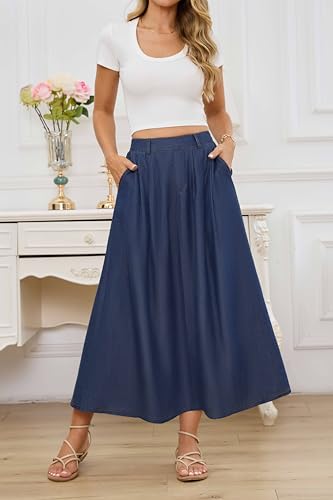 Lightweight Long Denim Skirts for Women A-line Jean Maxi Casual Skirt with Pockets Elastic Waist 1