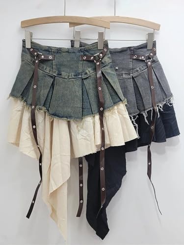 More information about Women's Denim Skirts High Waist Patchwork Irregular Burrs Edge Folds Ribbons Short Skirt