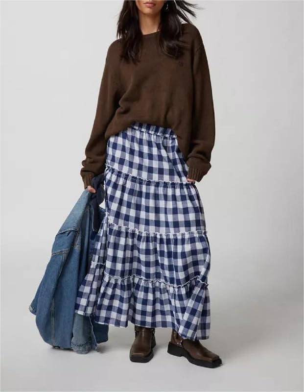 HOT ! Women Plaid Tiered Maxi Skirt Y2k Elastic High Waist Long Skirt Print Flowy A Line Skirt Gingham Swing Midi Skirts