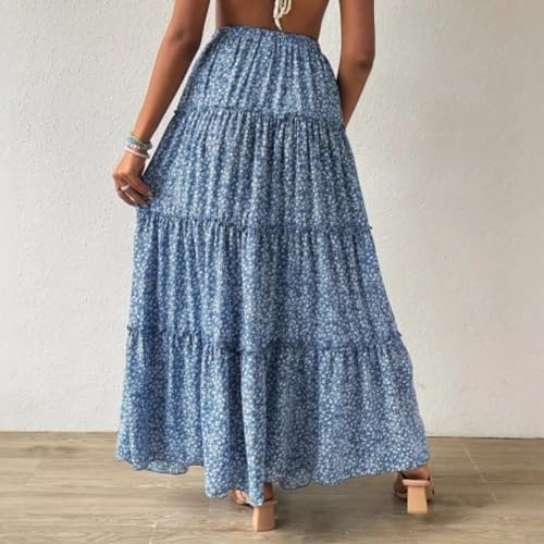 Women's Long Skirts Small Floral Elastic Waistband Three Layer Splicing A line Pleated Big Swing Dresses for Women 5