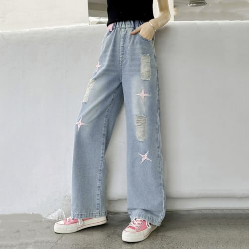 Girls' Jeans Elastic High Waist Wide Leg Baggy Denim Pants Bootcut Streetwear 7