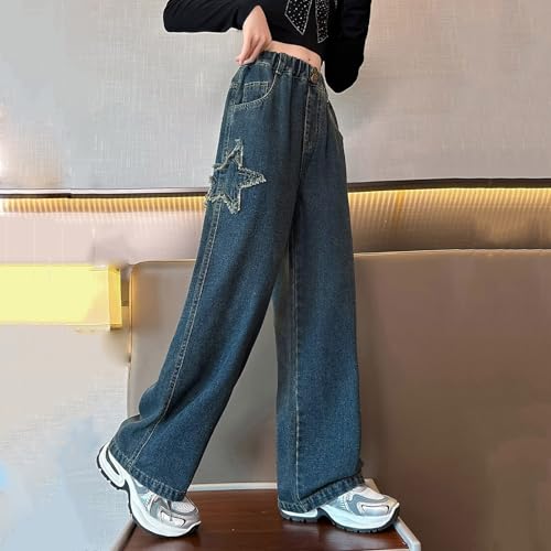 HOT ! Viatabuna Girls Wide Leg Star Jeans Elastic Waist Cute Embroidery Baggy Pull On Jeans for Kids with Pockets 5-14 Years