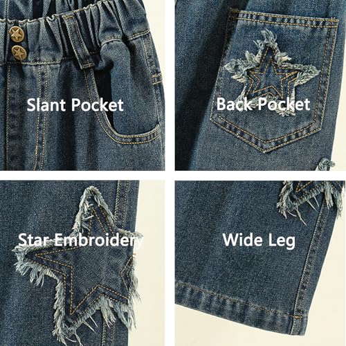 Viatabuna Girls Wide Leg Star Jeans Elastic Waist Cute Embroidery Baggy Pull On Jeans for Kids with Pockets 5-14 Years 4
